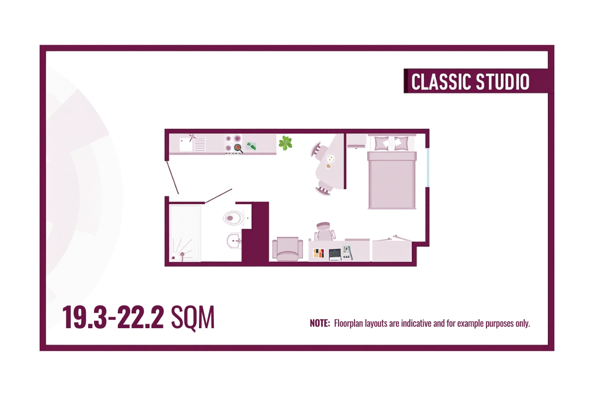 A well-designed private studio with en-suite and kitchenette, offering all essentials including a small double bed with storage, study area, wardrobe, and under-counter kitchen appliances — all conveniently located on the ground floor.