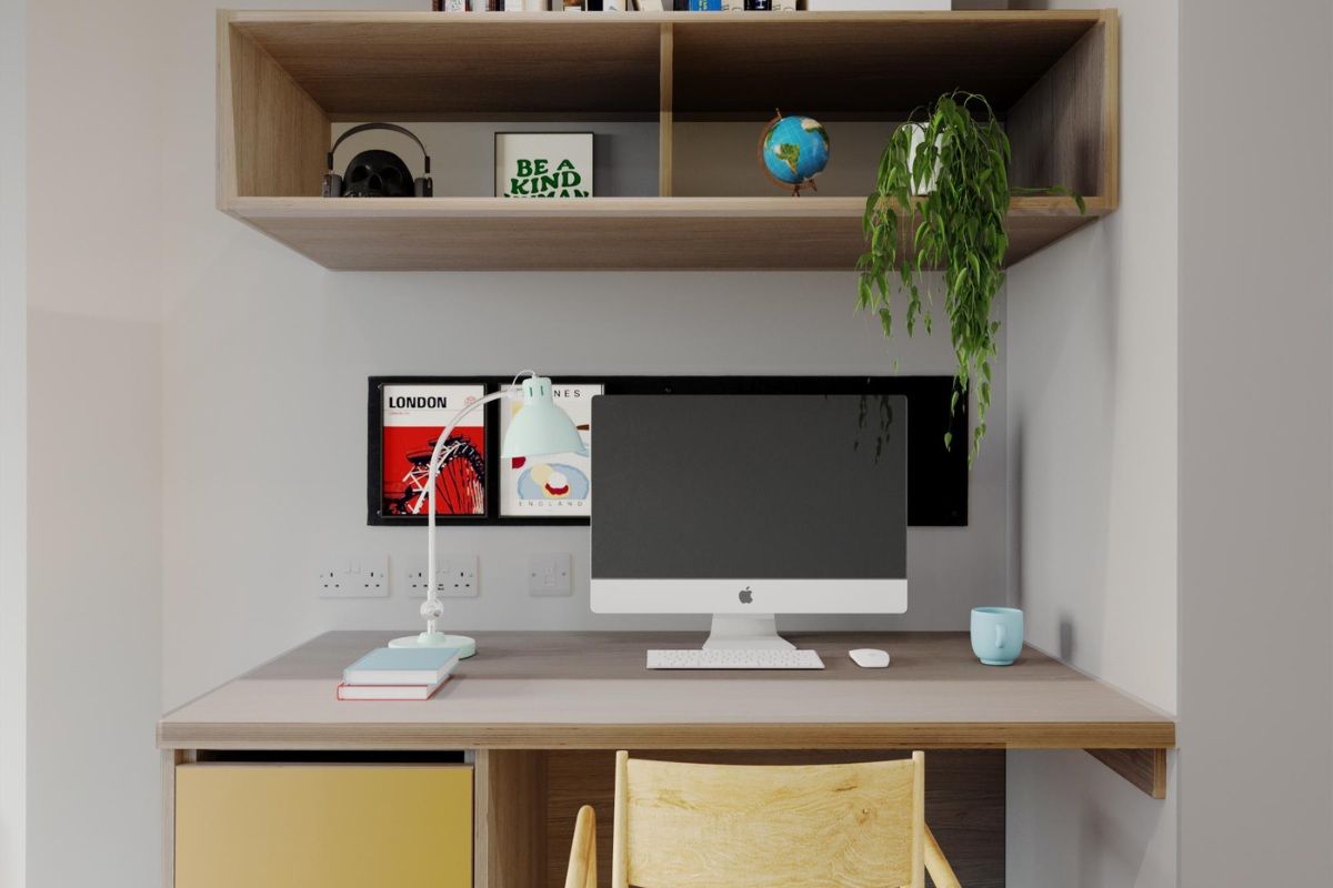 Inside, the studio is thoughtfully arranged to support both study and relaxation. A compact double bed provides a comfortable sleeping area, while the dedicated study space creates a practical setting for focused work. The private kitchenette allows you to prepare meals with ease, and the en suite bathroom ensures complete privacy. Ample storage solutions help keep the room organised, making the Bronze Studio an efficient and comfortable home tailored to modern student living.